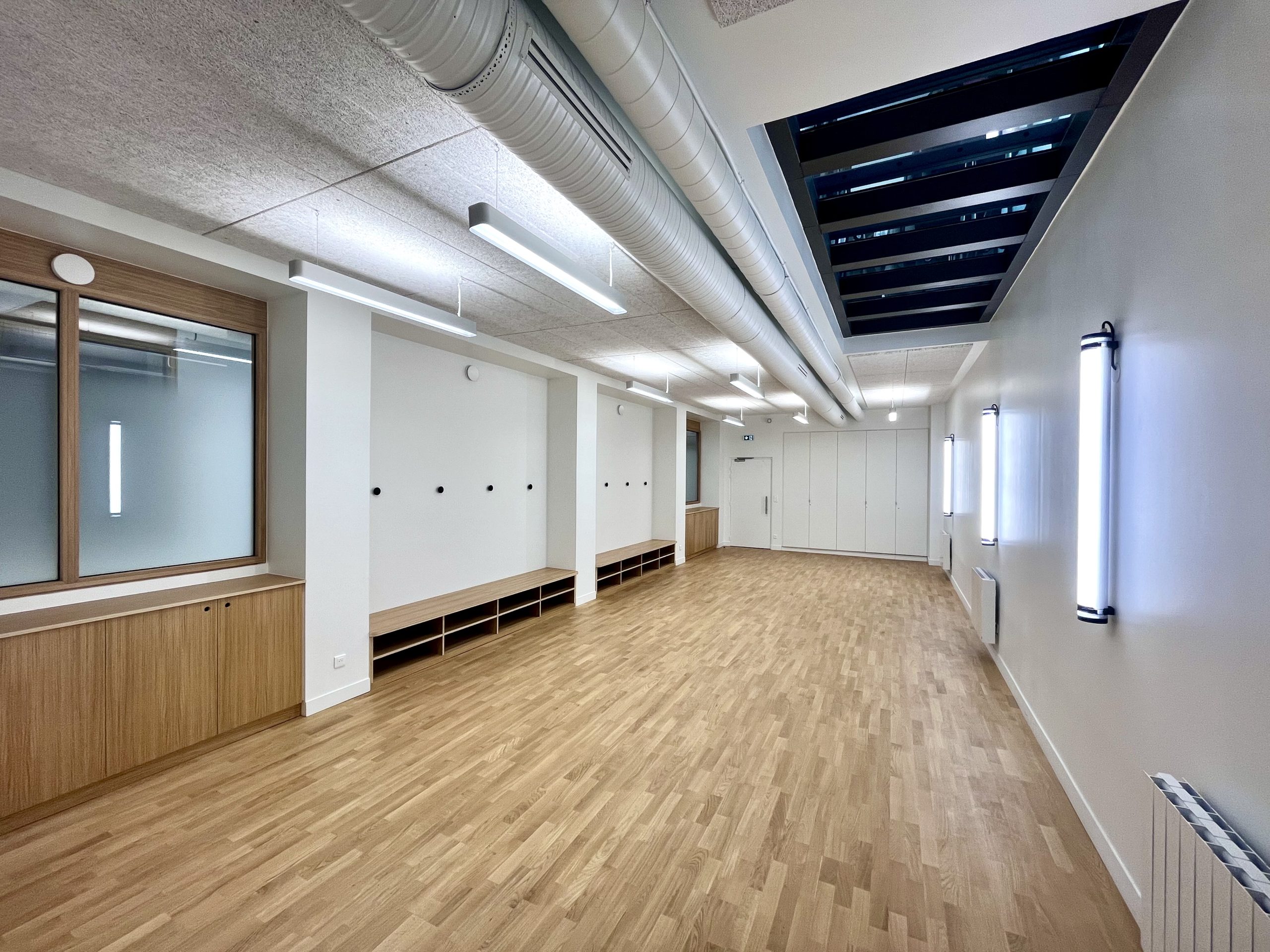 From the courtyard on the rue Cadet, the entrance hall welcomes visitors with its large elegant glass windows. It offers a comfortable seating area and ten co working spaces, a spacious conference room as well as a quiet work space. Then, underneath the skylight is a large rehearsal studio (130m2 or 1400 square feet) with a sprung dance floor and access to dressing rooms.